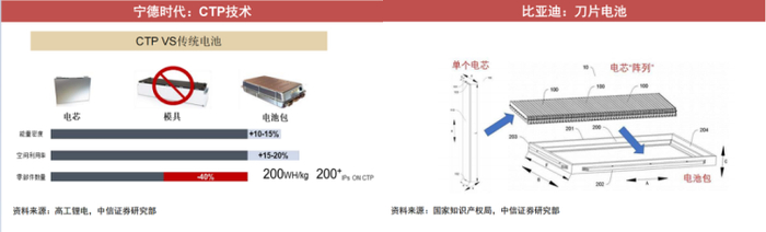 当前以比亚迪为代表的的刀片电池,选择的是彻底取消模组的方案;宁德时代的CTP电池,则是走将小模组整合为大模组的路线。