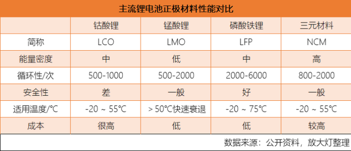 不同正极材料差距明显,适用领域也不一样。常见的正极材料可以分为钴酸锂(LCO)、锰酸锂(LMO)、磷酸铁锂(LFP)和三元材料(NCM)。