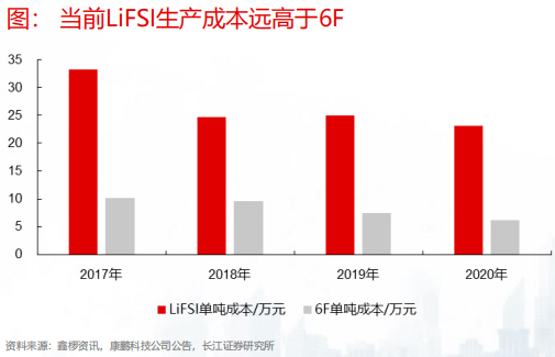 新一代锂盐中,双氟磺酰亚胺锂(LiFSI),被认为有望替代六氟磷酸锂。相较于传统锂盐,LiFSI的的热稳定性更高,而且在电导率、循环寿命、低温性能等方面均有优势[16]。