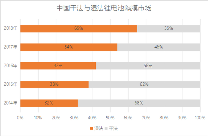 当前隔膜材料的主要市场趋势十分确定。由于更加符合动力电池高能量密度的要求,可以延长电池循环寿命,且能增加电池大倍率放电能力,湿法工艺正在对干法形成快速替代。数据显示,2017年湿法锂电池隔膜的市场份额首次超过干法隔膜,而仅一年后的2018年,市占率就进一步上升至了65%。