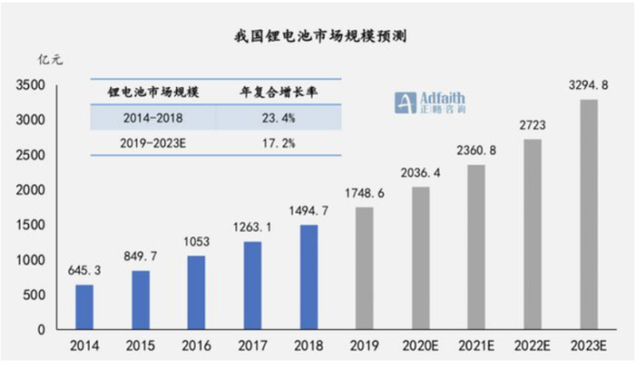 随着电子产品迭代、新能源汽车强势发展以及政府对于提高节能环保要求,锂电池的市场规模有望进一步扩大,预计2023年市场规模有望达到3294.8亿元,相应的动力电池将实现1600亿以上的规模[4]。