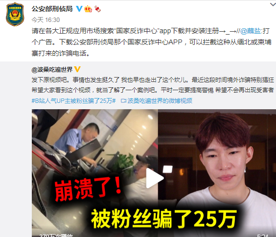 7月17日,波桑将这段经历发布在微博上,后被公安部刑事侦查局官方微博转发,并配文称“请在各大正规应用市场搜索‘国家反诈中心’App下载并安装注册。”