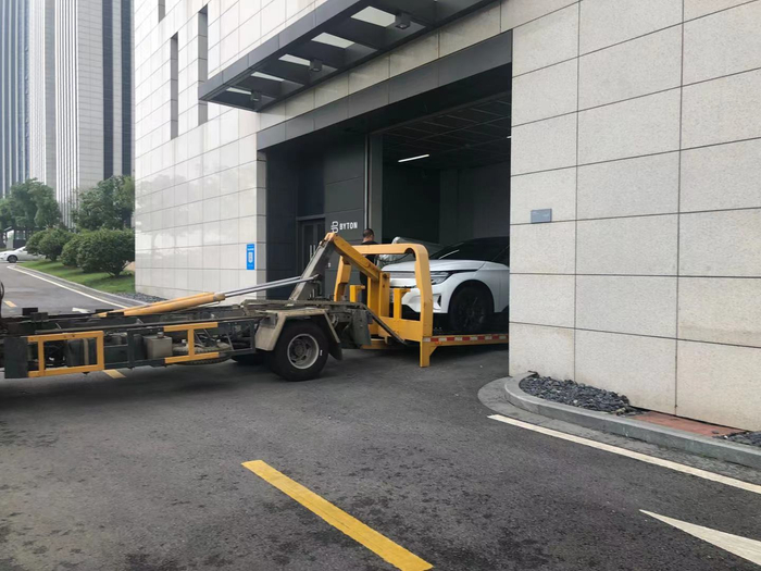 非常巧合的是,一辆黄色拖车正准备将一辆拜腾汽车运走。时代财经注意到,这辆拜腾汽车的车身下半部为白色,上半部分主要是黑色,轮胎为纯黑色。