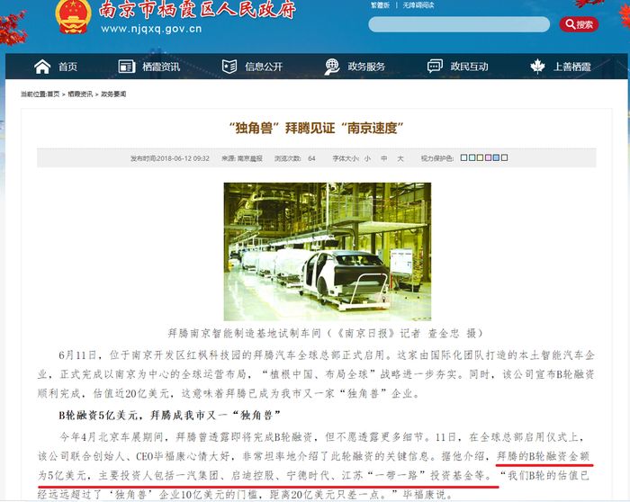 时代财经注意到,南京市栖霞区人民政府官网在2018年6月12日曾发布过一则名为“‘独角兽’拜腾见证‘南京速度’”的消息,其中提到,6月11日,拜腾汽车联合创始人毕福康曾透露,“拜腾的B轮融资金额为5亿美元,主要投资人包括一汽集团、启迪控股、宁德时代、江苏‘一带一路’投资基金等。”