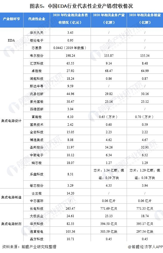 华大九天是我国EDA本土最大企业,2020年华大九天EDA业务营收为3.45元。概论电子2020年营收为0.95亿元。其它EDA行业产业链代表性企业产销/营收情况如下: