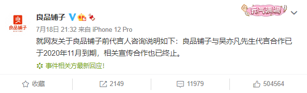 前一天,伴随都美竹猛料逐渐释出,韩束、云听立刻做出了反应。7月18日晚上7时,韩束发布微博表示已向吴亦凡方发出《解决告知函》,已终止一切品牌合作关系。随后,晚上10时左右,云听APP发布微博声明:“云听已终止与吴亦凡的一切合作,其不再担任云听‘声音推荐官’。云听APP及第三方平台账号,已对吴亦凡参与录制的全部内容做下架处理。”良品铺子与吴亦凡的代言合作已在2020年11月到期,但在舆论声音的不断发酵以及网友的追问下,良品铺子最后不得不专门在微博上发布澄清声明。