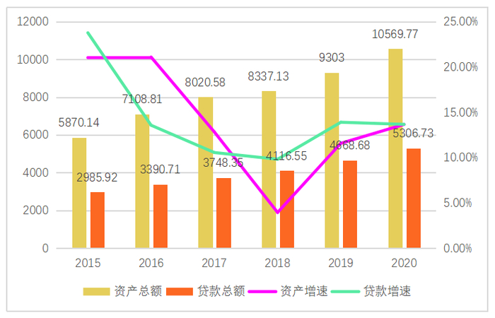 贷款总额由2015年的2986亿元上升至2020年的5307亿元,增幅达77.7%。其中,2015年增幅较大,此后五年增速较为平稳,贷款总额稳步上升。