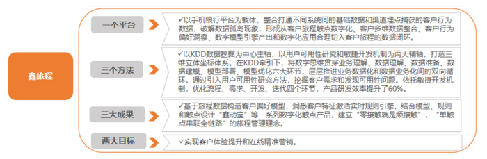 此外,还利用数据权重矩阵和IV值等方法,建立“鑫指数”动态反映客户旅程过程,透过指数进一步发掘客户偏好、跟踪业务成效,实现客户旅程动态观测,为行内理财定价提供参考。