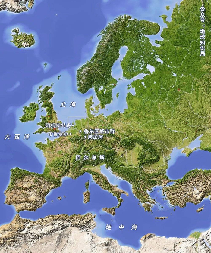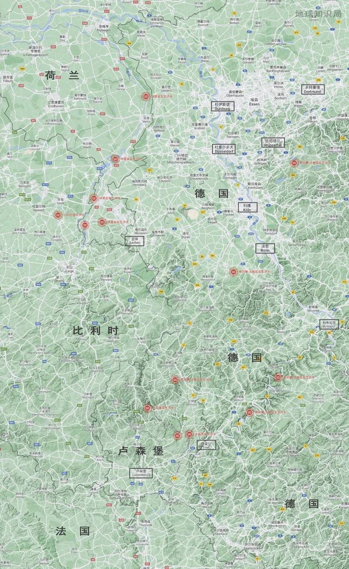 此处恰恰又是欧洲人口最集中的地区之一。荷兰、比利时、卢森堡三国以经济发达,人口密集著称。德国是目前的主流强国里人口分布较为均衡的国家,各地都有以特色产业闻名的城市,没有出现一城独大的情况。然而,德国西部地区由于资源、交通和历史原因,人口较多,经济也更为发达,分布着众多实力雄厚的大小城市。