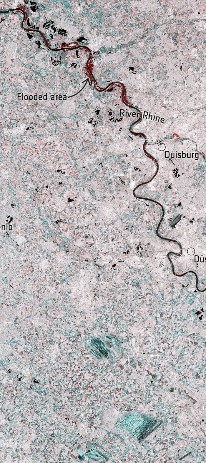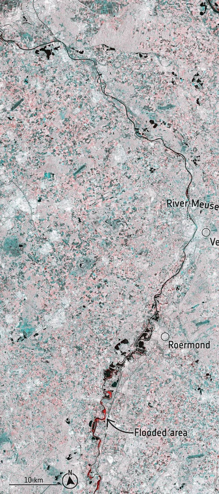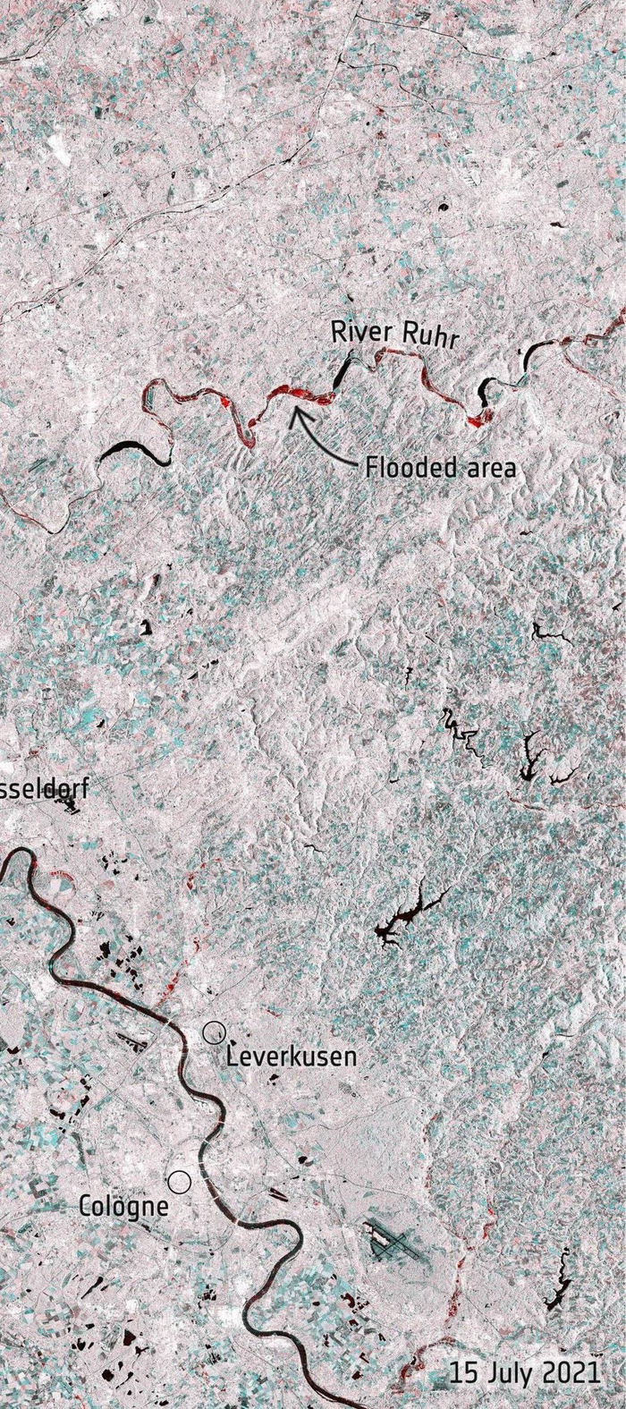 默兹河、莱茵河、鲁尔河洪水淹没的区域(红色)(图:European Space Agency)▼