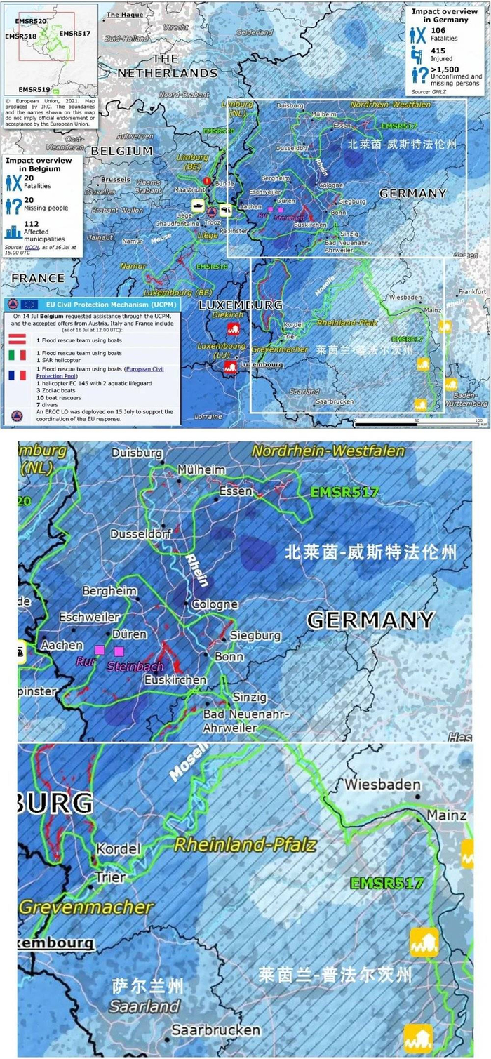 我们对德国工业熟知的鲁尔区、萨尔区就在这一区域,隔壁就是荷兰、比利时、卢森堡,这次全都成了重灾区(图:JRC, European Commission)▼