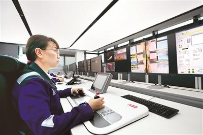 在天津港集装箱码头公司远程操控中心,巾帼班女司机正在监控全自动化堆场集装箱装卸作业。