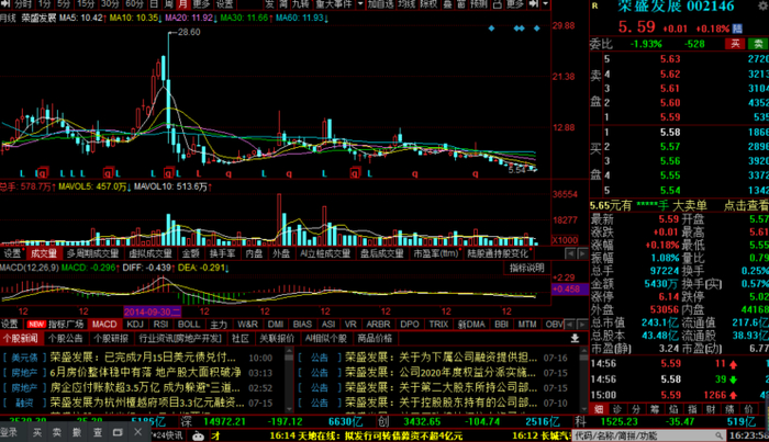 截至7月16日收盘,荣盛发展股价报5.59元/股,总市值243.06亿元,今年以来下跌14.3%,股价一直处于下行通道,并创下2016年以来的股价历史新低。