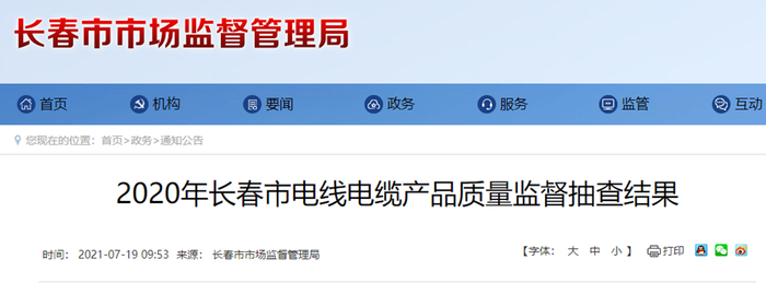 原标题:长春市市场监督管理局电线电缆产品抽检 10批次不合格
