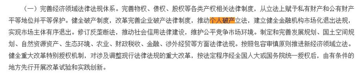 2020年5月, 中共中央、国务院印发的《关于新时代加快完善社会主义市场经济体制的意见》提出,健全破产制度,改革完善企业破产法律制度,推动个人破产立法,实现市场主体有序退出。