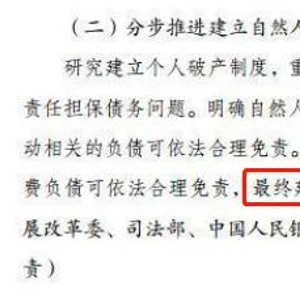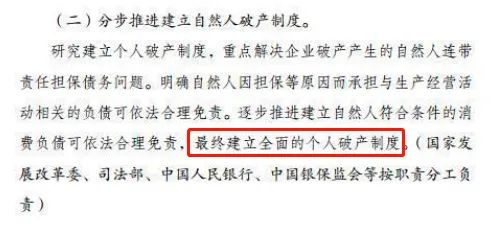 此后,国家发改委财金司有关负责人就《加快完善市场主体退出制度改革方案》答记者问时表示,改革方案提出分步推进建立自然人破产制度。需要强调两点:首先,个人破产制度是为陷入严重财务困境但诚实守信的个人提供债务重组机会,促进债务人继续创业创新,同时起到防范居民部门债务风险、维护社会稳定的作用,前提是任何人不得恶意逃废债;其次,建立个人破产制度是一项涉及面广、复杂程度高的系统性工作,需立法先行而后逐步推开,当前重点任务是在充分建立社会共识基础上推动个人破产立法。