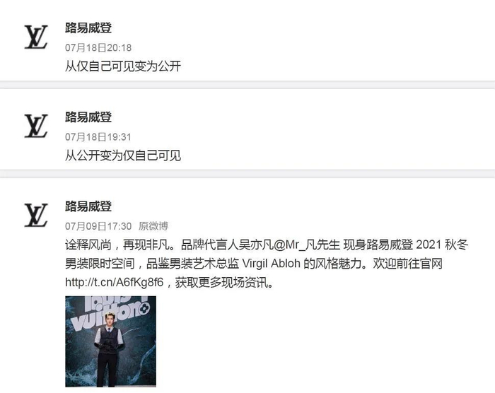 不过,截至发稿,分别签约吴亦凡作为全球品牌代言人、全球代言人的宝格丽、欧莱雅男士并未有任何动作。更让人看不懂的是,路易威登(LV)将7月9日发布的一条带有“品牌代言人吴亦凡”词条的内容,先是在7月18日19时31分“从公开变为仅自己可见”,又在20时18分“从仅自己可见变为公开”。