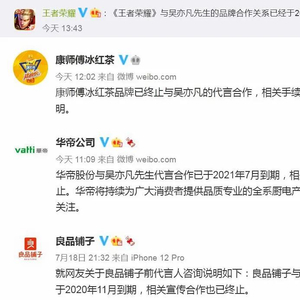 19日稍早,华帝公司发文称与吴亦凡代言合作已于2021年7月到期,相关宣传合作已完成及终止。康师傅冰红茶发布声明称,“已终止与吴亦凡的代言合作,相关手续正在办理中”。