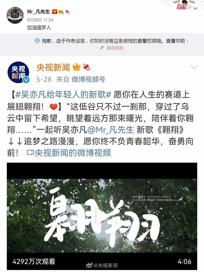 不仅如此,吴亦凡此前置顶的微博“加油追梦人”,也由于原作者设置权限无法访问,这条原博是央视新闻发布的吴亦凡新歌《翱翔》。
