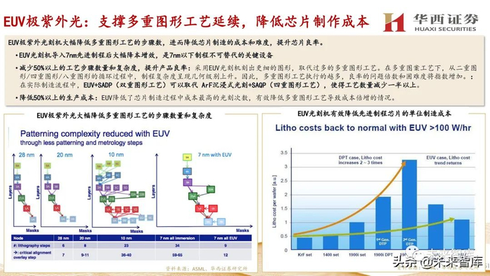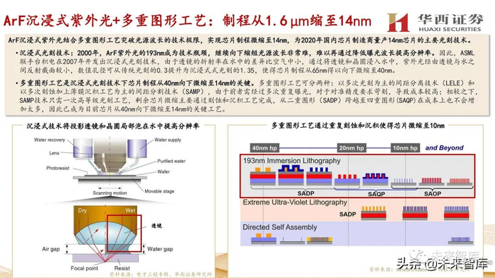 先进制程采用多重图形工艺,实现芯片微缩:芯片的先进制程总共需要数十层掩模版和数百道的刻蚀和薄膜沉积工艺。在紫外光波长只有193nm的 情况下,为了使得芯片达到14nm以下的线距,需通过反复循环刻蚀和薄膜沉积,逐层将掩膜板上的细微结构图形转移到晶圆上。