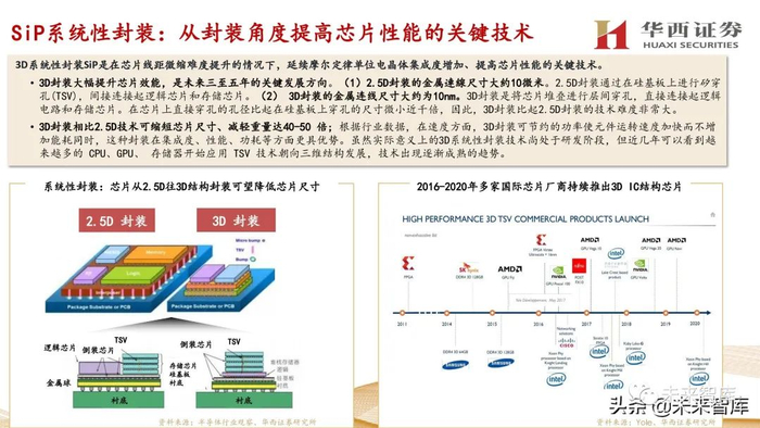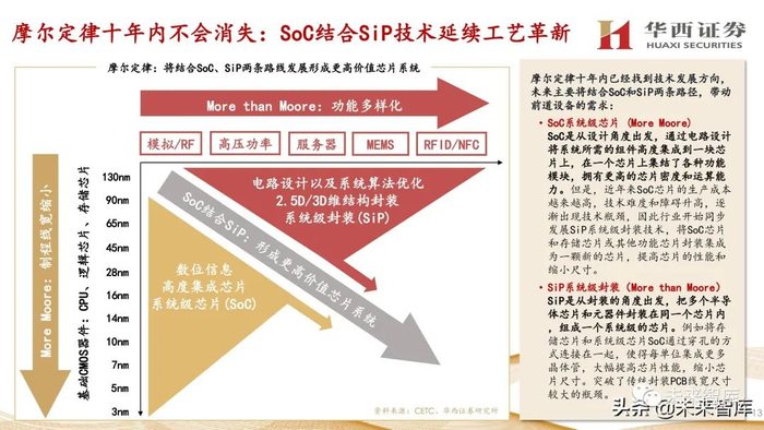 未来十年,行业已经具备延续摩尔定律的技术工艺。即使行业部分声音认为半导体距离制程微缩的极限已经不远,摩尔定律将逐渐失效。但是纵 观来看,只要科技持续创新,就仍然有方法提高电晶体的密度,例如:3D芯片制造技术和系统性封装技术。
