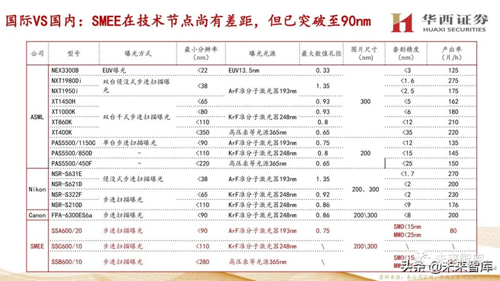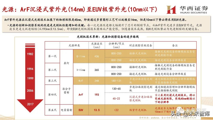 光刻机的曝光工艺:通过紫外光源照射掩模版,将掩模版上的图形缩小十倍刻印在覆盖晶圆的光刻胶之上,完成图形从掩模版转移至芯片。光刻工艺的流程为(1)光刻胶涂抹:将光刻胶按照离心力均匀涂抹在晶圆上;(2)前烘烤:软烤光刻胶;(3)光刻曝光:使用光学系统,以紫外光照 射掩模版,使得光刻胶上没有掩模版遮蔽的区域化学键会遭到破坏,过程中光源从掩模版投影到晶圆上的图形节点大约会缩小4至10倍,因此,光 刻曝光是芯片制程微缩的关键工艺。例如10nm的芯片是通过100nm的掩模版投影形成;(4) 后烘烤:硬烤光刻胶。(5)化学显影:使用显影液将化 学键被破坏的光刻胶溶解去除,在光刻胶上显影出芯片图形,分为正光阻和负光阻两种,现在普遍使用正光阻;