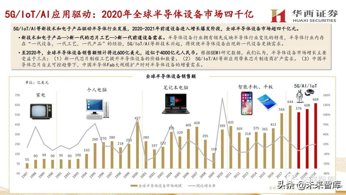 新技术和电子产品—>新一代的芯片工艺—>新一代前道设备需求。半导体设备行业拥有领先反映半导体行业变化的特质,半导体行业内存 在“一代设备,一代工艺,一代产品”的经验,5G/IoT/AI等新技术兴起,将促使半导体设备出现新一代设备更换需求。