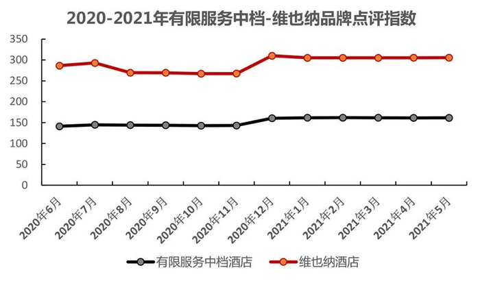 2020-2021年有限服务中档酒店点评指数年平均值为152.32,环比增长4.78%,目标客群满意度有所增长。从点评指数波动来看,下半年商务旅游出行仍处于疲软状态,以商务客群为主的中档酒店市场点评指数缓慢恢复,下半年伴随着商务会议开放复苏,有限服务中档酒店指数企稳后呈现增长态势。维也纳品牌点评指数与有限服务中档点评指数发展趋势基本一致,但基本是平均点评指数的2倍。