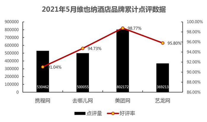 在线点评信息已成为潜在客户、忠诚的消费者和口碑传播的引擎。消费端包括群体的细分化、体验丰富化、品质、渠道、价格均成为消费者选择旅游住宿的考虑因素。维也纳品牌在OTA渠道、自有预订渠道和会员体系,持续加深与客群的长期联系,不断提升其网络口碑和客群满意度。从维也纳酒店点评量来看,酒店品牌点评量超过220万条,网络口碑表现强劲,平均好评率均超过95%。目前,OTA平台垄断市场已然形成,美团网、携程网、艺龙网、去哪儿网是酒店营销最主要的主要OTA平台。其中,美团、携程最具竞争优势,酒店覆盖最广,实际客群点评量最高;其次,去哪儿客群点评数量也较多,艺龙点评量最少,整体好评率较高。