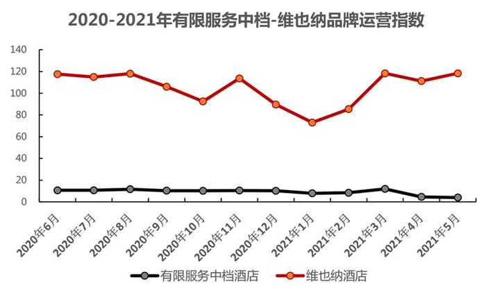 2020-2021年,有限服务中档酒店品牌运营指数持续增长,指数环比增长3.42%;疫情期间,中档酒店市场面临着单体体量小、集中度偏低、运营效率低、获客成本高等难题,酒店品牌调整发展战略,加强酒店数字化、线上化的系统构建,精准流量引入等线上线下结合布局,突破发展瓶颈。维也纳酒店在此期间运营指数虽呈现较大幅度波动,但整体呈现高位发展,平均运营指数为104.89。