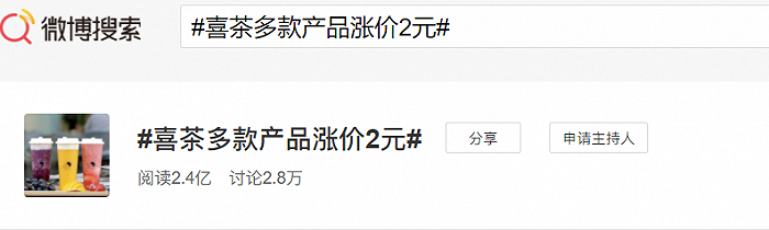 这一下就把“贫穷·爱喝奶茶·打工人”们给激怒了,很快,微博上#喜茶多款饮品涨价2元#话题阅读量超过2亿,#奶茶进入30元时代#也被网友们齐心协力刷屏了。