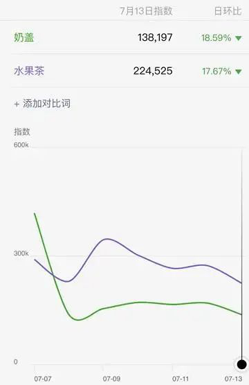 以微信指数来看,奶盖的热度指数为138197,完全不及水果茶224525的热度指数;再看百度指数,其并没有收录任何关于“奶盖茶”、“芝士茶”类似的关键词。奶盖茶不论是从消费者评价、声量、销量上都呈现断崖式下跌。