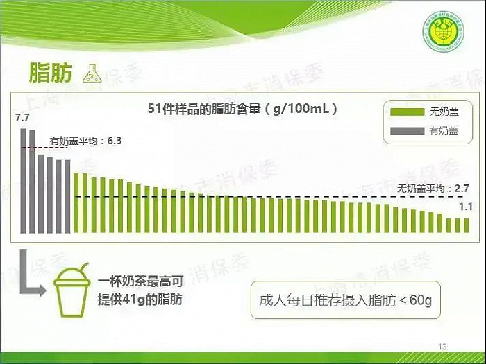 划重点!正常来说,一个成人每日推荐摄入的脂肪量要小于60g。那也就是说,和一杯喜茶的奶盖茶,摄入的脂肪量就已经超过成人每日推荐摄入脂肪量的2/3了。