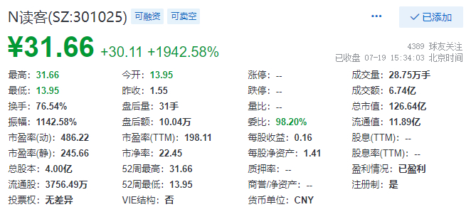 今日(7月19日),读客文化股份有限公司(以下简称读客)在深圳证券交易所创业板正式上市。截至收盘,股价为31.66元,较1.55元发行价上涨约19倍,动态市盈率达到486倍。