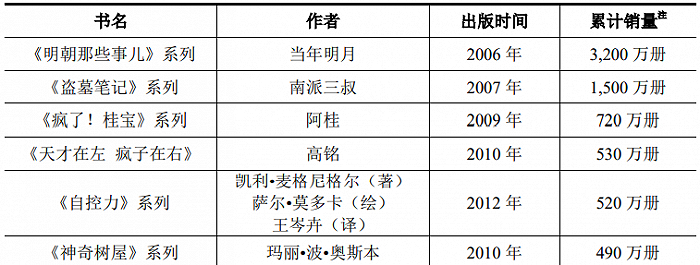 漫画产品线中,《阿狸》系列卖了230万册;少儿产品线中,《疯了!桂宝》系列销量720万册,《神奇树屋》系列销量490万册,《酷虫学校》系列销量210万册。