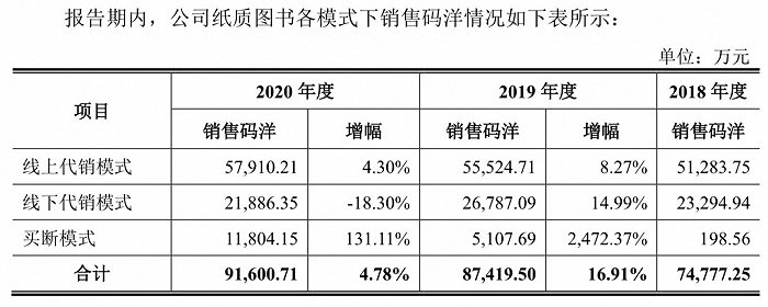 纸质图书销售模式主要为线上代销和线下代销,买断模式收入占比较低。