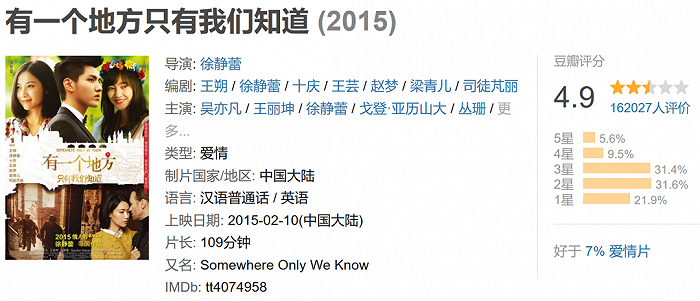 凭借颜值和初始流量,吴亦凡出演了徐静蕾的电影《有一个地方只有我们知道》,该影片累计票房2.8亿。