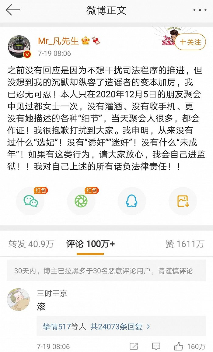对此,7月19日上午,吴亦凡在微博公开回应,否认存在上述行为,并声称:“如果有这类行为,我会自己进监狱。”目前,该微博评论量已经突破100万,而在最高赞评论中,只写着一个“滚”字。