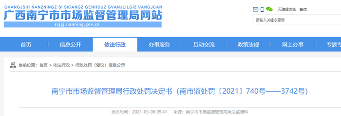 中国质量新闻网讯 近期,南宁市市场监督管理局发布行政处罚决定书(南市监处罚〔2021〕1086号)。处罚书全文如下。