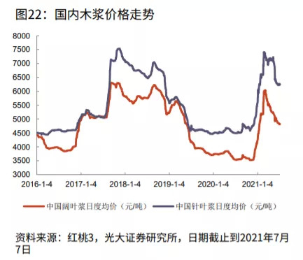 资料显示,在通胀&供需紧平衡共振下,自2020年7月起至今年5月针叶浆、阔叶浆价格自574、469美元/吨提升至997、783美元/吨,涨幅分别达74%、67%,预期全球浆价将持续上行至2021年Q4。