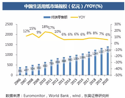 据Euromonitor的统计数据显示,2019年,我国生活用纸市场规模约1337亿元,至2020年市场规模将扩大至近1416亿元。人均角度来看,2020年中国人均家外消费纸巾金额仅为3.1美元,而美国人均商销纸巾消费额为25.8美元,国内商销渠道对比美国依然有6倍以上的增长空间。