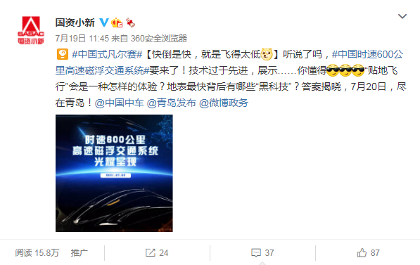 时速600公里高速磁浮列车来了:央企速度实现地表最快!