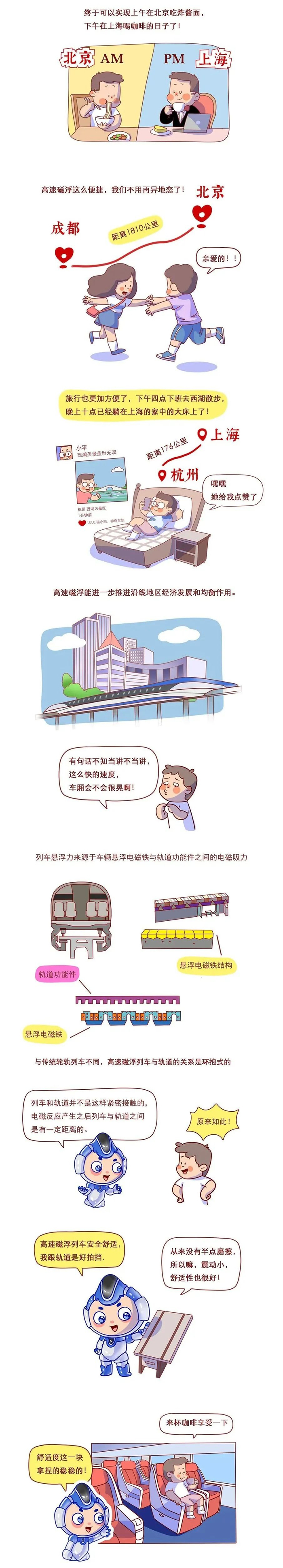 据悉,高速磁浮拥有“快起快停”的技术优点,能发挥出速度优势,也适用于中短途客运。此次下线的我国时速600公里高速磁浮交通系统,高速磁浮车加速到每小时600公里,只需要3.5分钟。