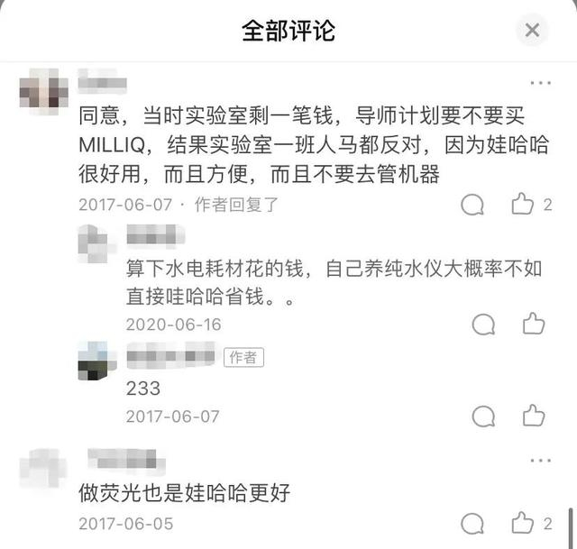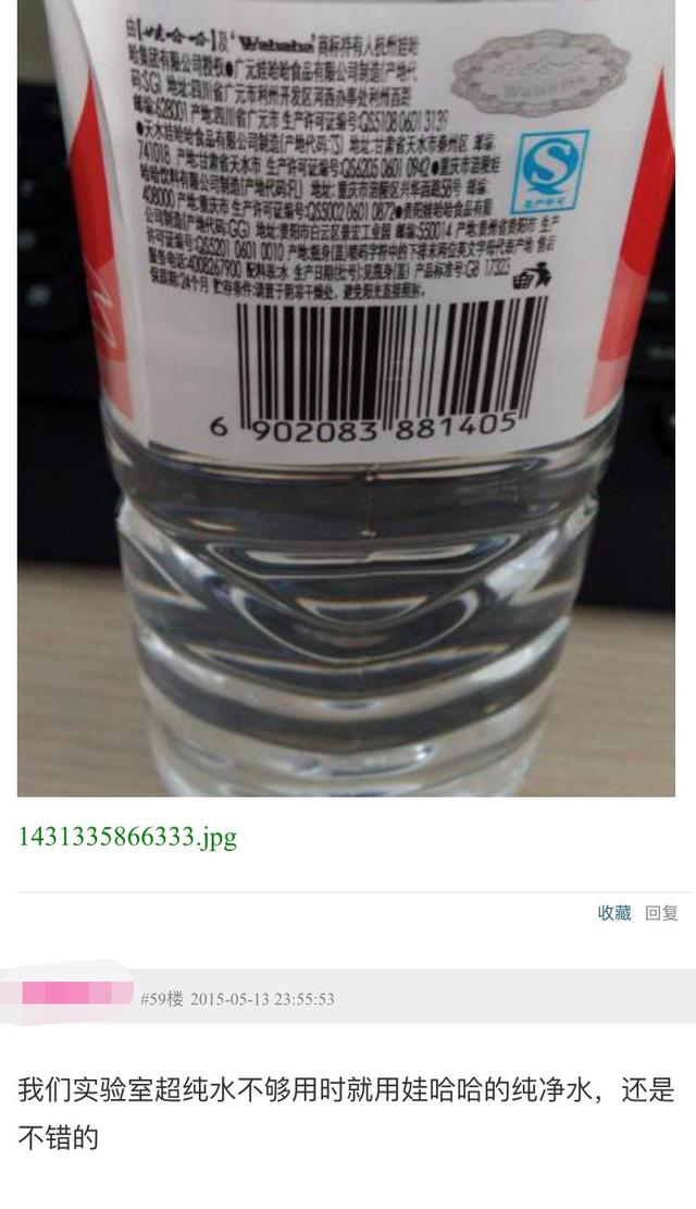 这张材料图在网上走红后,又有网友发现,娃哈哈纯净水在国内实验室内同样被广泛使用。许多实验室工作者早前就已经在网上晒出自己的实验室经历并表明用娃哈哈纯净水做实验是更好的选择。