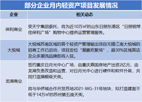 轻资产发展方面,大悦城、龙湖等企业今年加大轻资产发展力度,在项目获取和推进上有所收获,同时发展方向上也有各自特色。