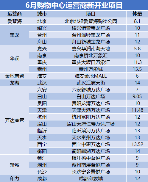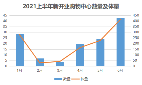 新开业购物中心上,6月共有43个新项目入市,总体量超400万平方米,数量及体量均达到上半年新高。