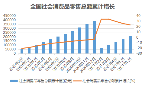 社会消费方面,上半年社会消费品零售额保持增长,累计录得211904亿元,累计增长23%。按消费类型分,与购物中心关联性较高的商品零售6月为33663亿元,同比增长11.2%,餐饮收入则录得3923亿元,增长20.2%,均实现同比稳定增长,社会整体消费氛围活跃。