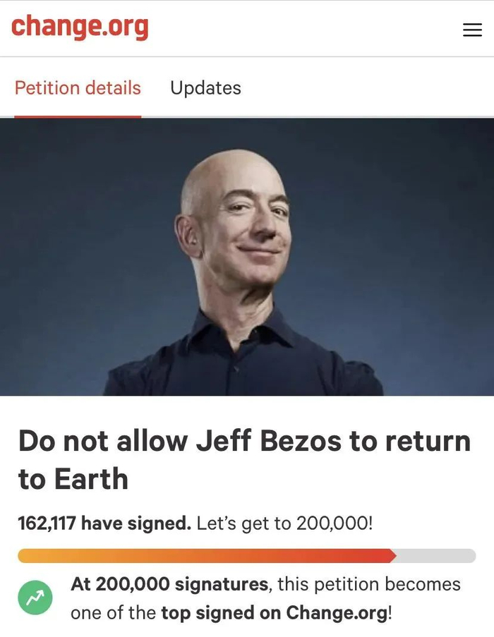 不被祝福也就罢了,甚至有人认为他“邪恶”。其中一名请愿发起者表示,贝佐斯是个“铁了心要统治全球的邪恶霸主”。他号召大家阻止贝佐斯返回地球,还称“人类命运就掌握在你们手中”。