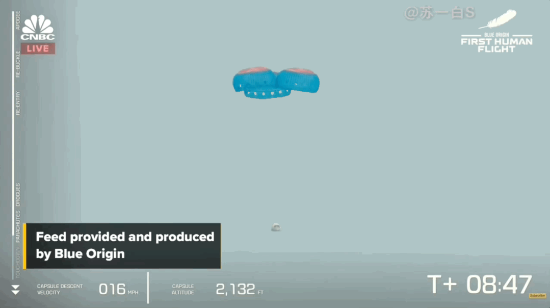 21点23分,也就是火箭点火11分钟后,返回舱成功着陆。贝佐斯出舱与地面人员击掌庆祝。