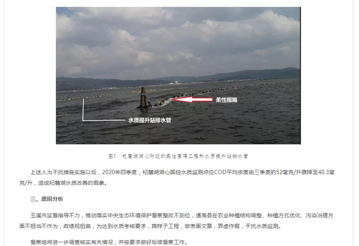 此前,中央第八生态环境保护督察组在玉溪市现场督察时发现,玉溪市通海县在杞麓湖污染治理工作中搞样子工程,水质日趋恶化。这些“样子工程”包括玉溪市投资2300万元,用PVC双面涂层防水布,在湖心国控监测点周边建成内外两圈U字型柔性围隔工程,从而在监测点周围形成一个相对封闭的水域,防止好水流出去、差水流进来的目的,从而人为干扰水质监测采样环境。